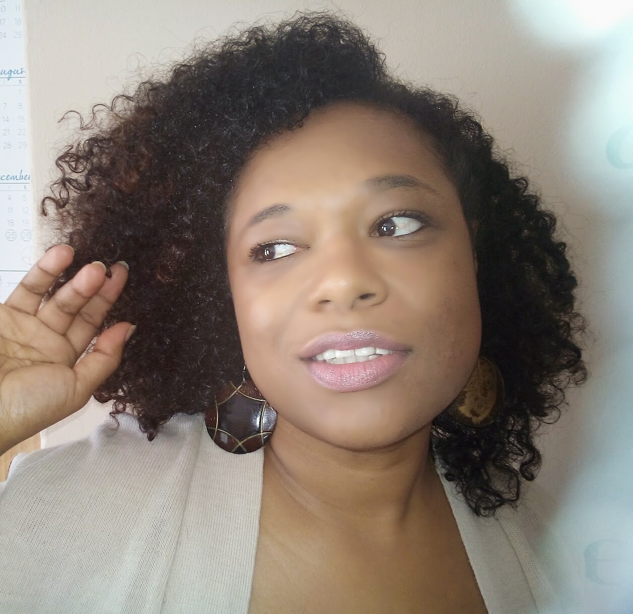 Today’s style is my absolute fave. I co-washed my hair using III Sisters of Nature Coconut co-wash. I love how it nourishes my hair. My curls appreciate the love. After *plopping my hair, I do the L.O.C method. I spritz my hair with some water (Liquid), then add some Oil to lock it in and then seal the hair with Cream. I used my treasured SheaMoisture Curl Enhancing Smoothie today (it smells so good I have to stop myself from tasting it). My hair then goes into a high pineapple style for a few hours to dry. After that I take down the pineapple and style (I braided the left side and secured with a bobby pin. I find this method stretches out my hair and I can actually hear the popping sound my curls make (just kidding)